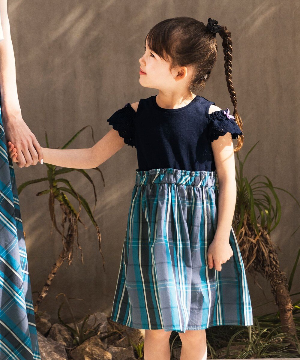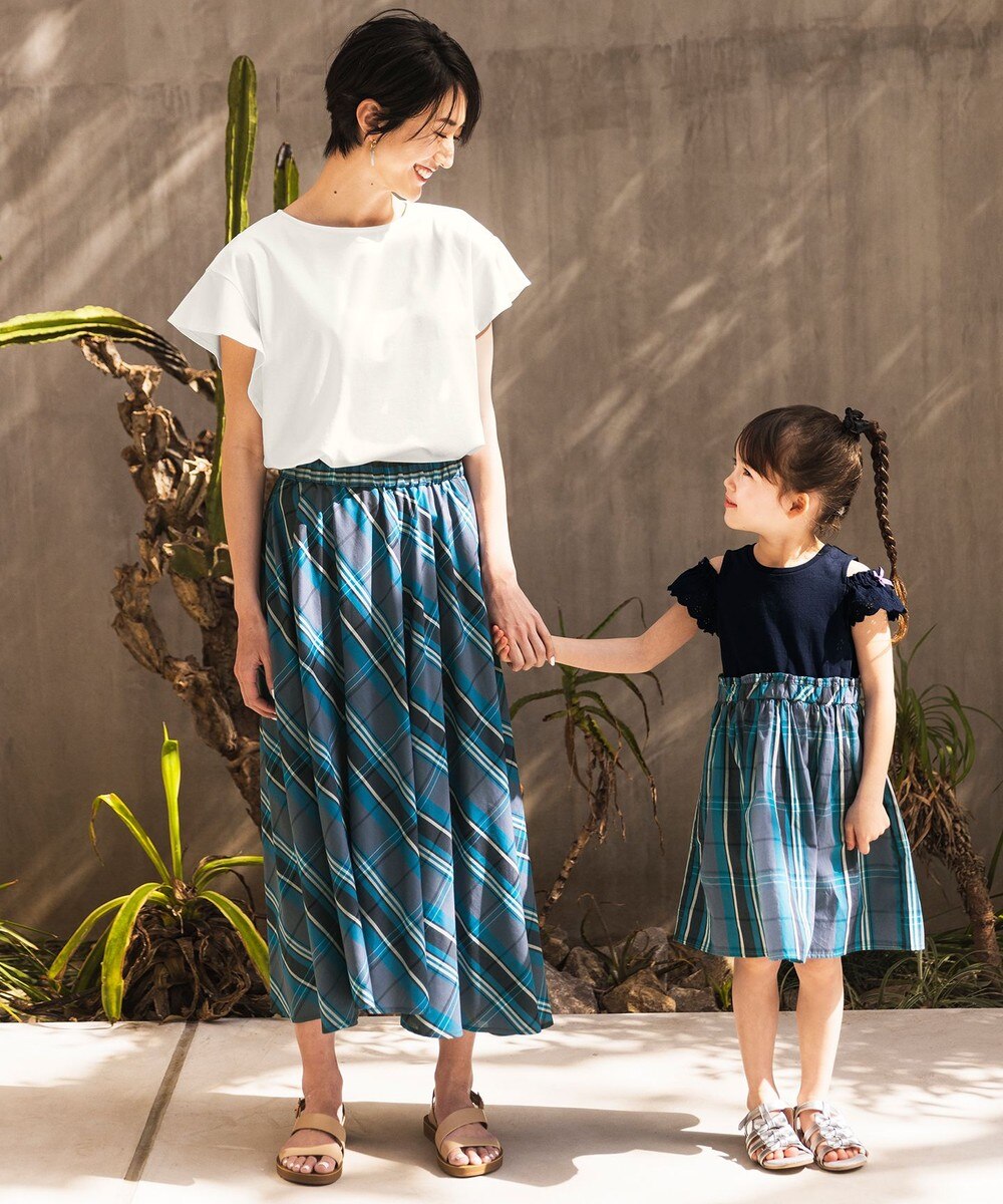 モデル着用の「マドラスチェックドッキングワンピース」は、親子や姉妹でリンクコーデが楽しめるレディースサイズ(フリー・XL)のロングスカートを同時販売中です!