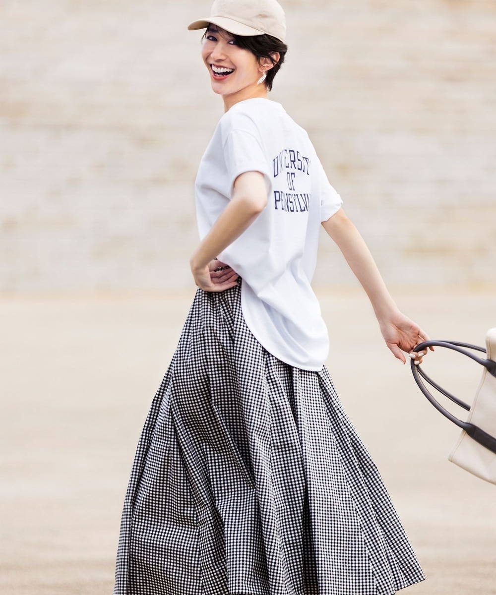 夏のお散歩コーデ☆涼しい接触冷感Tシャツ&人気の黒ギンガムチェック柄ロングスカート