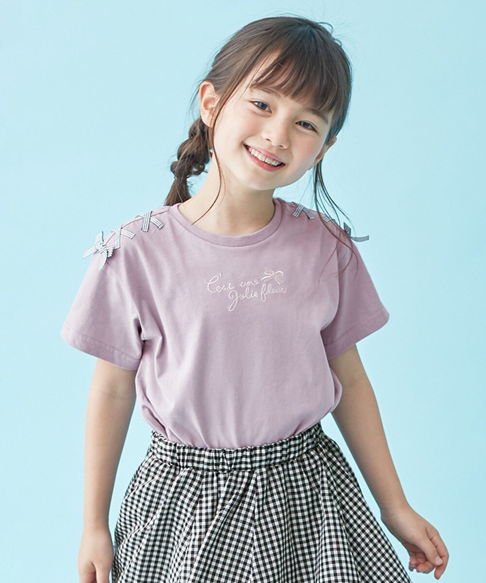 くすみパープルがドンピシャ好みな袖レースTシャツ〜!接触冷感素材を仕様している夏休みにぴったりなアイテムです♪ギンガムチェックのロンスカもかわいいね。